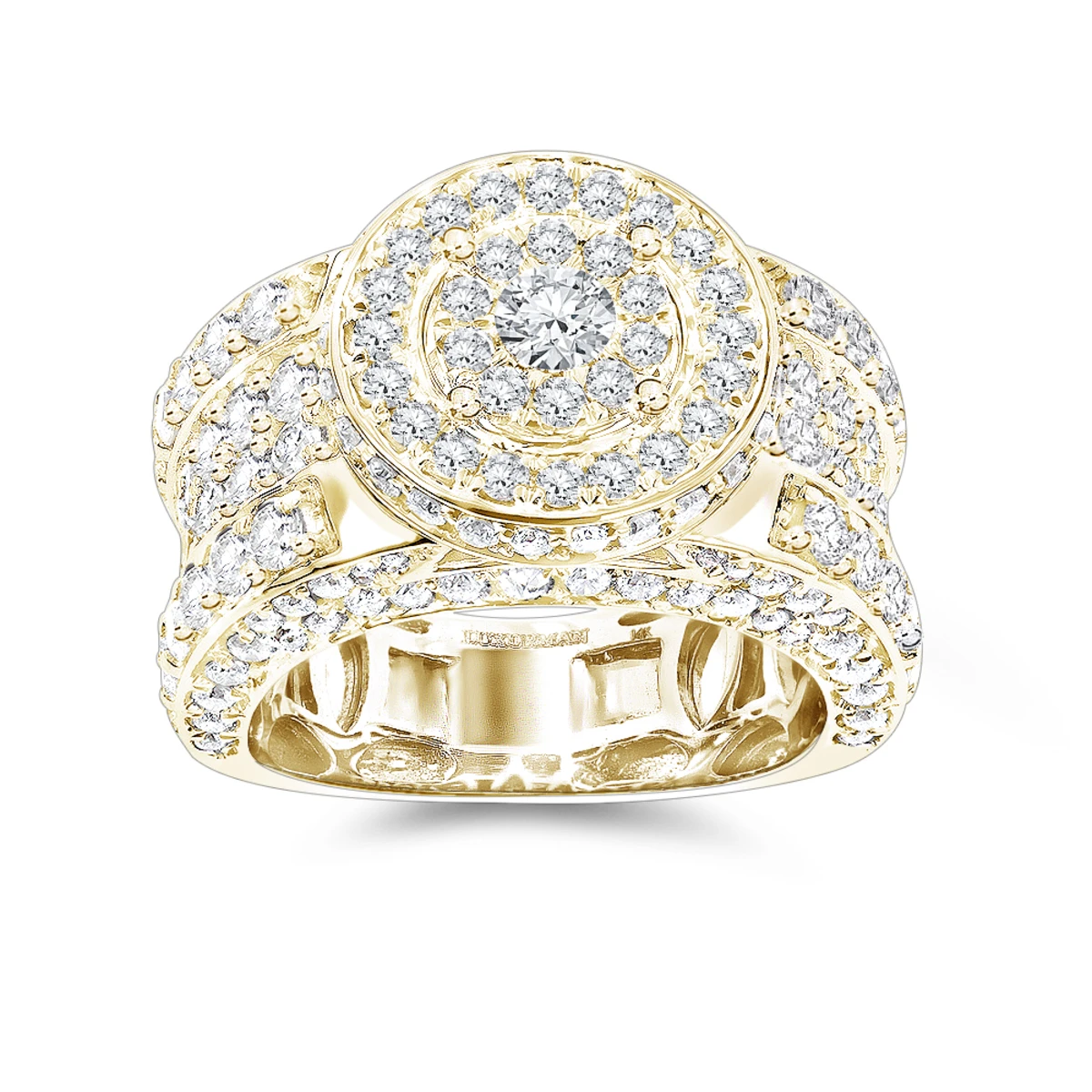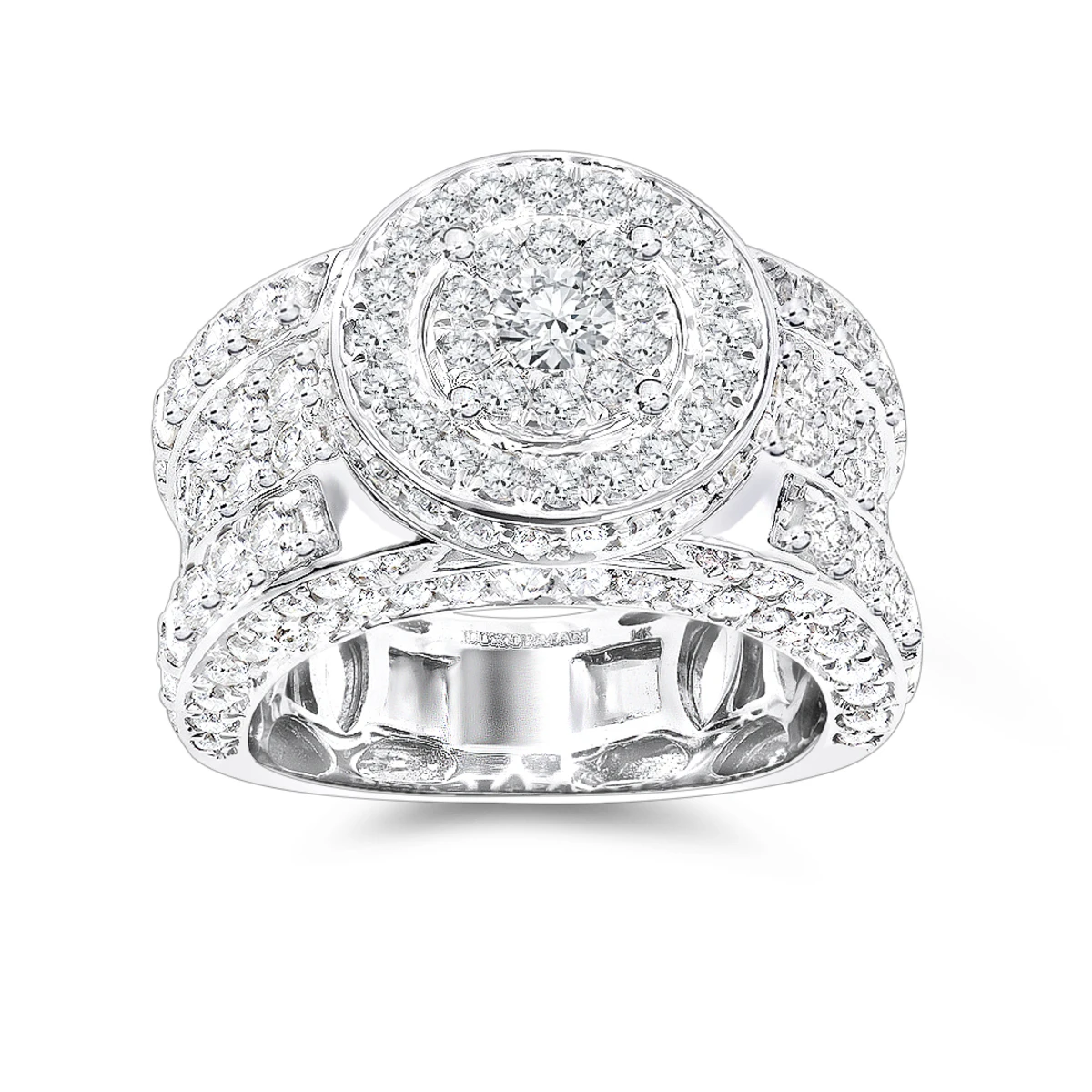 This Unique Halo Diamond Engagement Ring in 14K gold with Round Cluster diamonds showcases 3.5 carats of high quality genuine diamonds. Featuring a beautiful, halo design, splendid cluster set diamonds as a center stone and pave round diamonds on the sides, this unique engagement ring is available in 14K white, rose and yellow gold.