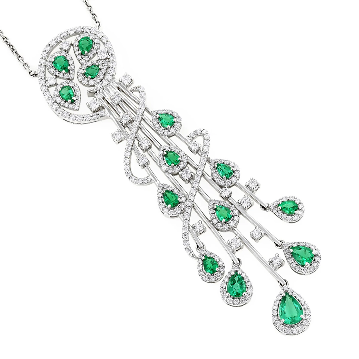 This Unique Ladies Peridot Diamond Chandelier Teardrop Necklace in 18K gold has a unique design and decorated with pave set dazzling diamonds and 3.03ct lush green peridots. Featuring an amazingly detailed waterfall design and highly polished gold finish, this gorgeous ladies diamond necklace is available in 18K white, yellow and rose gold. Length of chain is approximately 18 inch.