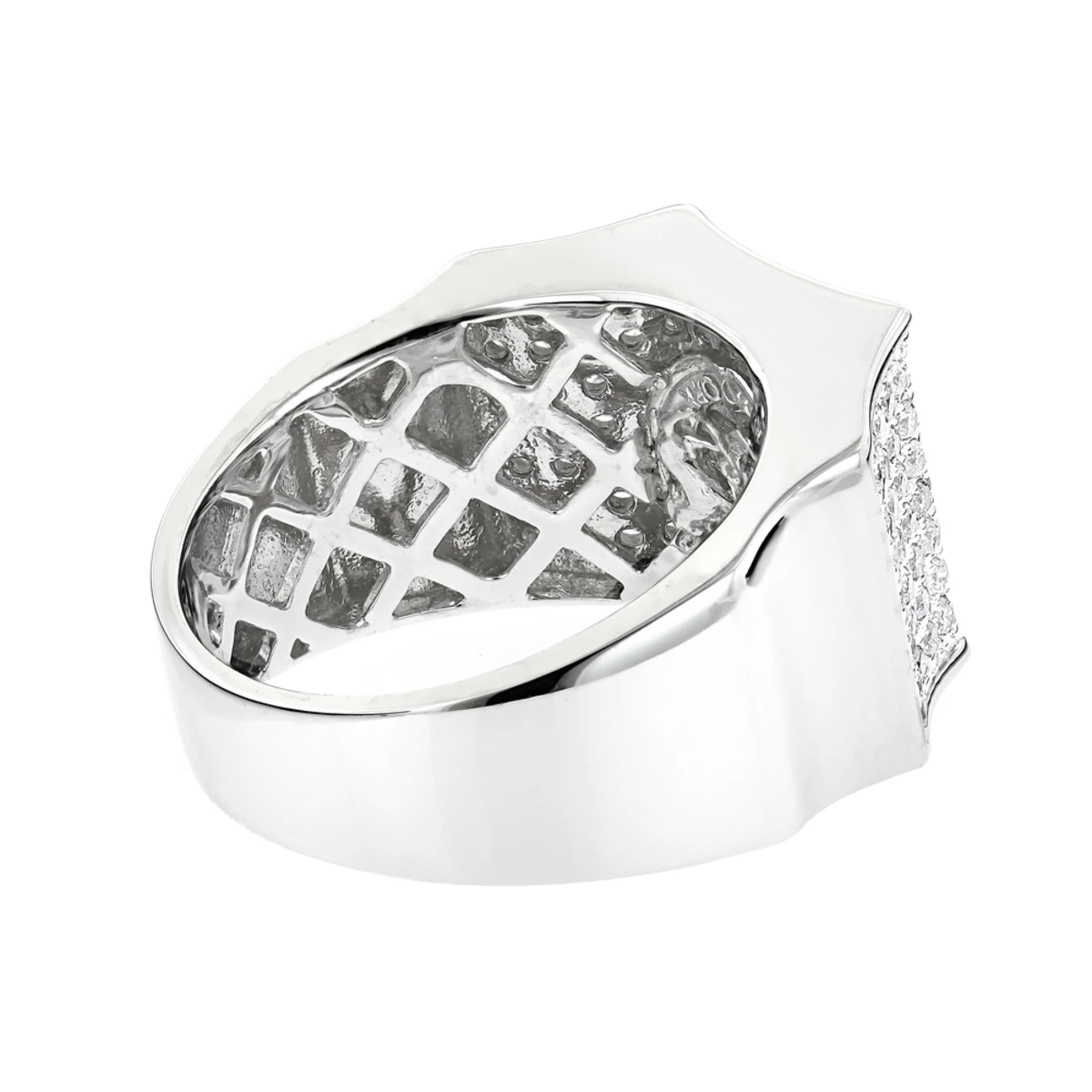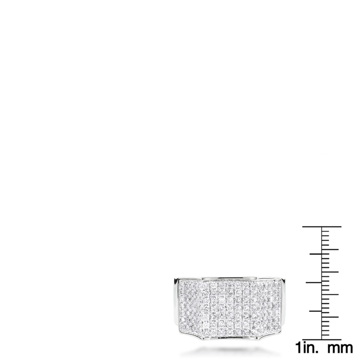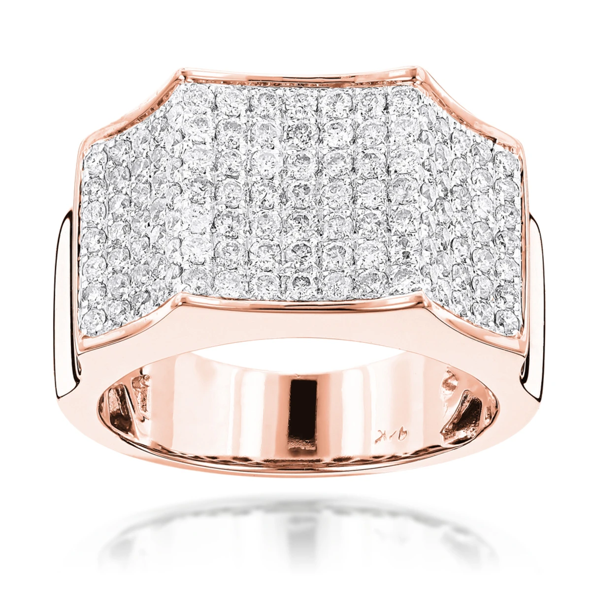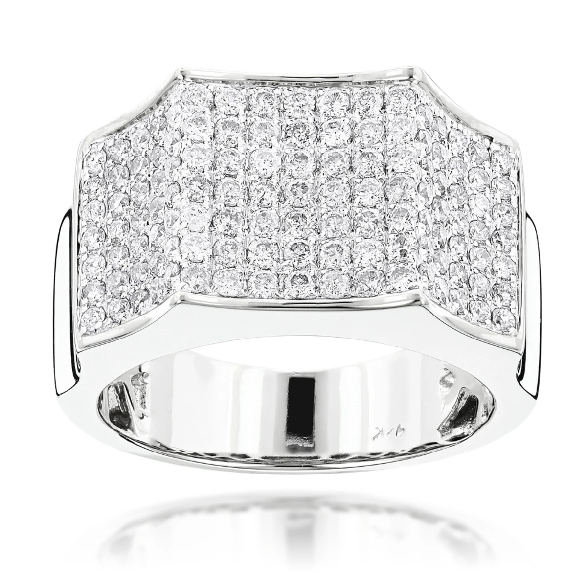This Men’s Diamond Ring in 14K gold showcases 2.07 carats of round brilliant diamonds in a pave setting. Featuring a unique design and a highly polished gold finish, this men’s diamond ring is available in 14K white, yellow and rose gold.