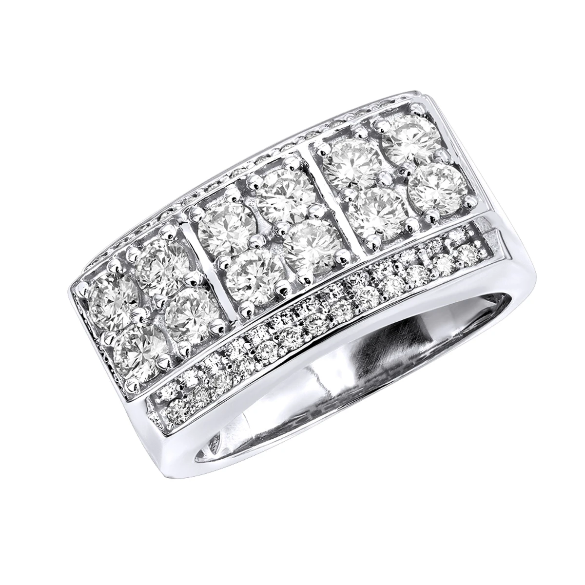 From our diamond rings for men collection: A modern and graphic design, this Designer Men’s Diamond Ring makes a great statement ring as well as a unique diamond wedding band for men; the ring showcases 2 carats of dazzling diamonds of top G color VS clarity masterfully set in 18K gold. This men’s diamond ring is available in 18K white gold, yellow gold and rose gold and was made to stand out. A highly polished gold finish and a rectangular shape lends character to the bigger and smaller round cut diamonds. The ring can be customized with any color and quality diamonds and also custom made in Platinum.