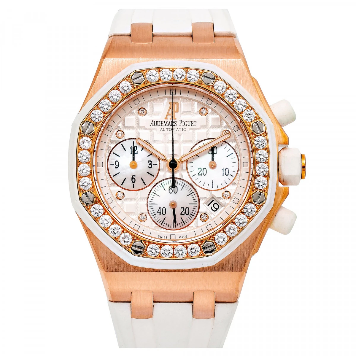 The Audemars Piguet Royal Oak Chronograph 37mm Silver Tone Dial Women’s Diamond Watch is a luxurious timepiece that is sure to turn heads. This watch features a stainless steel case with a diameter of 37mm and a bezel of 18K rose gold set with diamonds. The bezel is further adorned with a white rubber bracelet for a comfortable fit. The silver tone dial is protected by a scratch-resistant sapphire crystal and is engraved with the Audemars Piguet logo. The watch is water-resistant up to 5 ATM and is powered by a quartz movement.This watch is the perfect accessory for any woman who wants to make a statement. The diamonds on the bezel add a touch of sparkle and glamour, while the silver tone dial gives the watch a classic and timeless look. The watch is also engravable, making it a great gift for a special occasion. With its luxurious design and quality craftsmanship, this watch is sure to become a treasured heirloom.